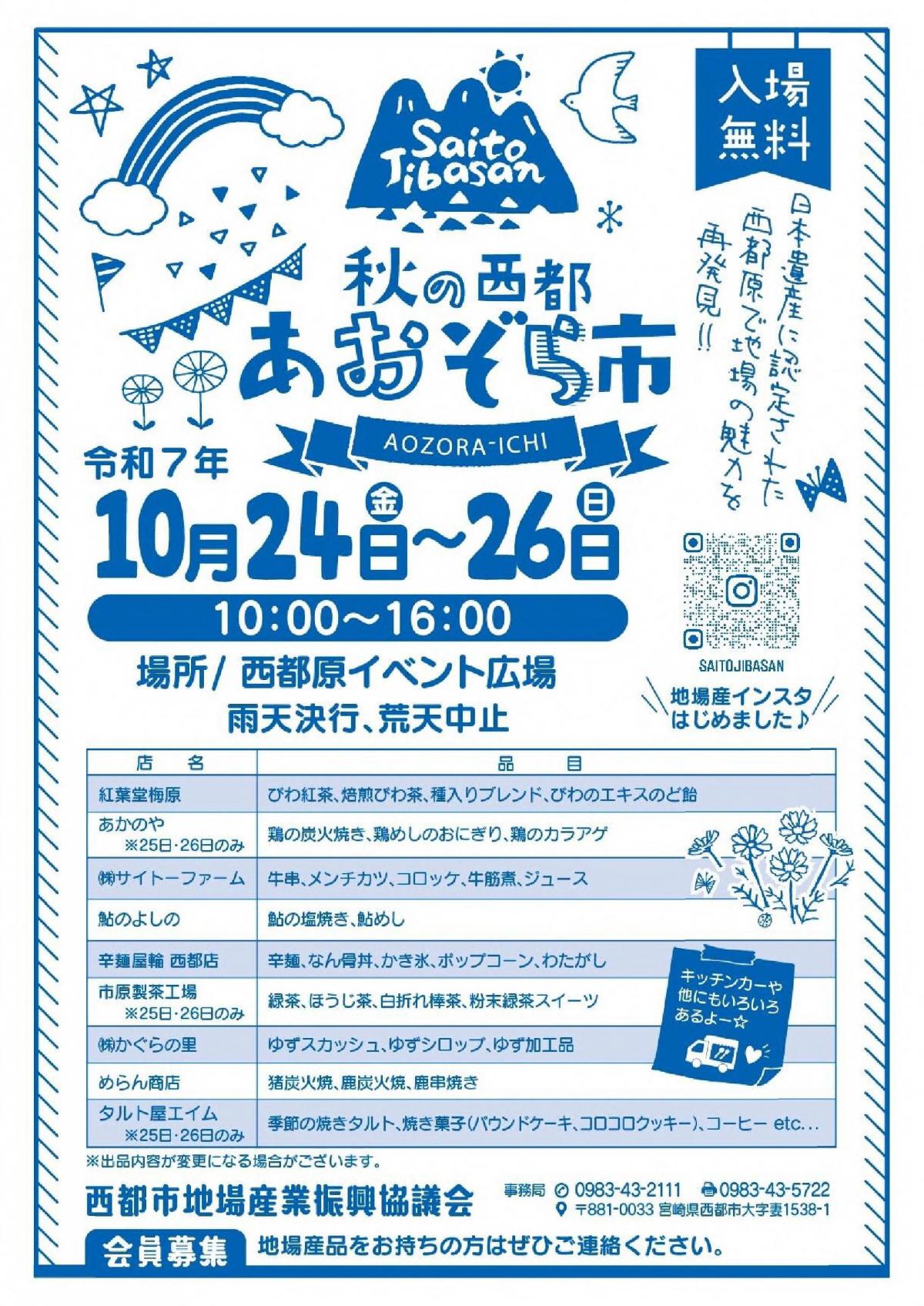 西都市地場産業振興協議会主催の物産展イベント「秋の西都あおぞら市」が開催されます。