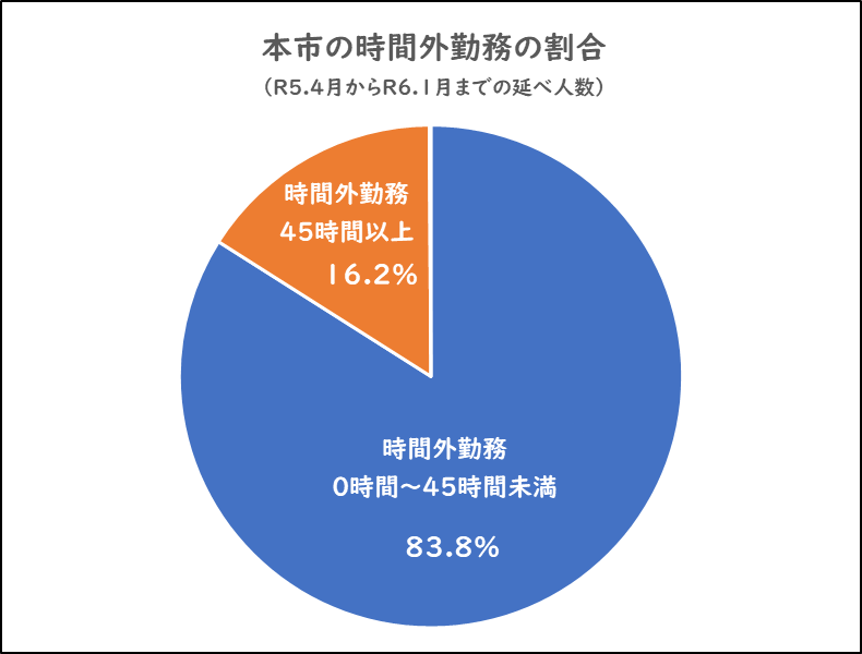 本市の教職員の83.8%は、県が目標とする、時間外勤務45時間未満となっていますが、16.2%の教職員が45時間以上となっており、そのうち0.5%は、過労死ライン相当にあたる80時間を超えて時間外勤務を行っている月がありました。
