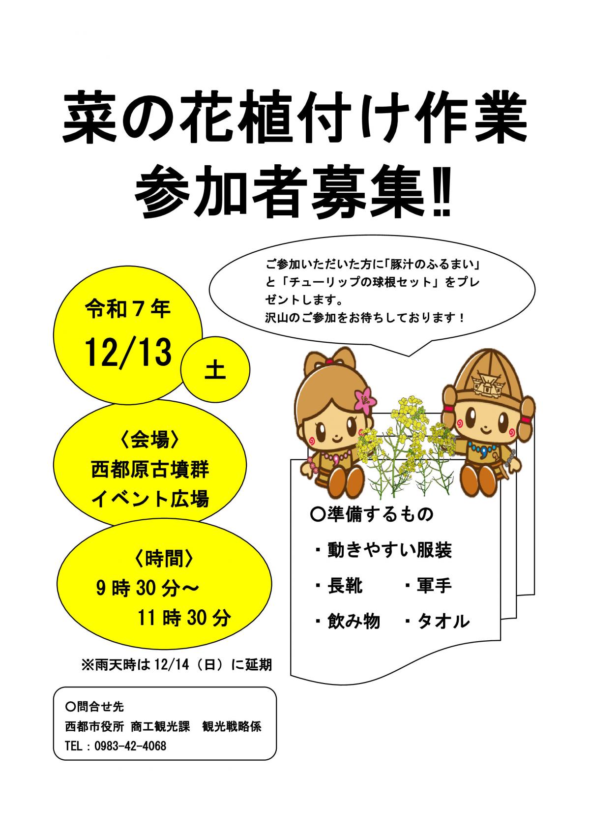 春の西都原を彩る菜の花の生育に向けた、毎年恒例の「西都原菜の花植付け作業」を行います。参加者には「豚汁のふるまい」と「チューリップ球根セット」をプレゼントします。参加を希望される方は、以下の問い合わせ先までご連絡ください。